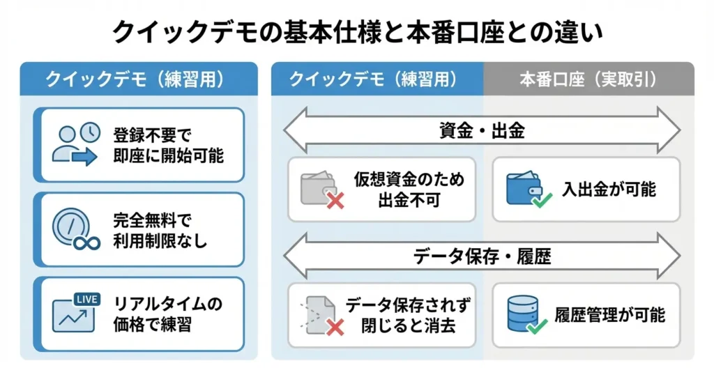 このセクションでは、クイックデモの基本的な特徴と本番口座との違いを整理し、自分が求めているデモ環境がこれに該当するかを判断できるようにします。