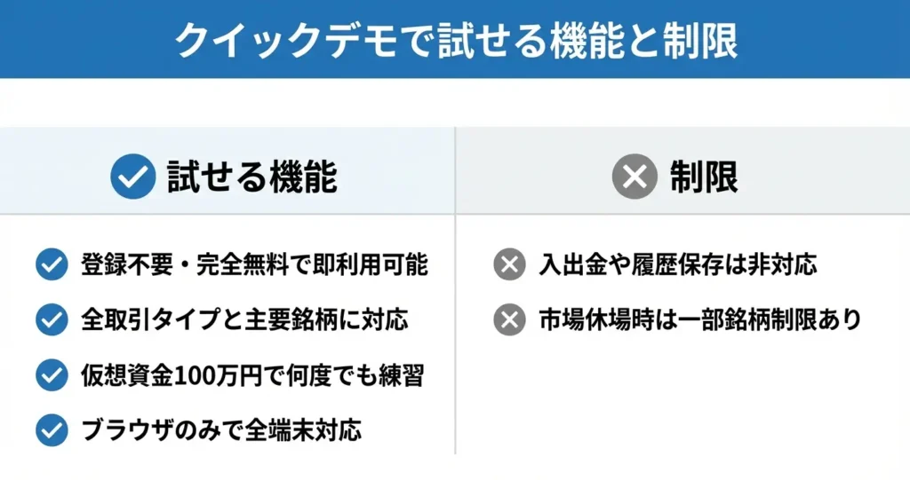 クイックデモは取引画面の操作感や注文の流れを確認するための環境であり、一部の機能は本番環境と異なります。
