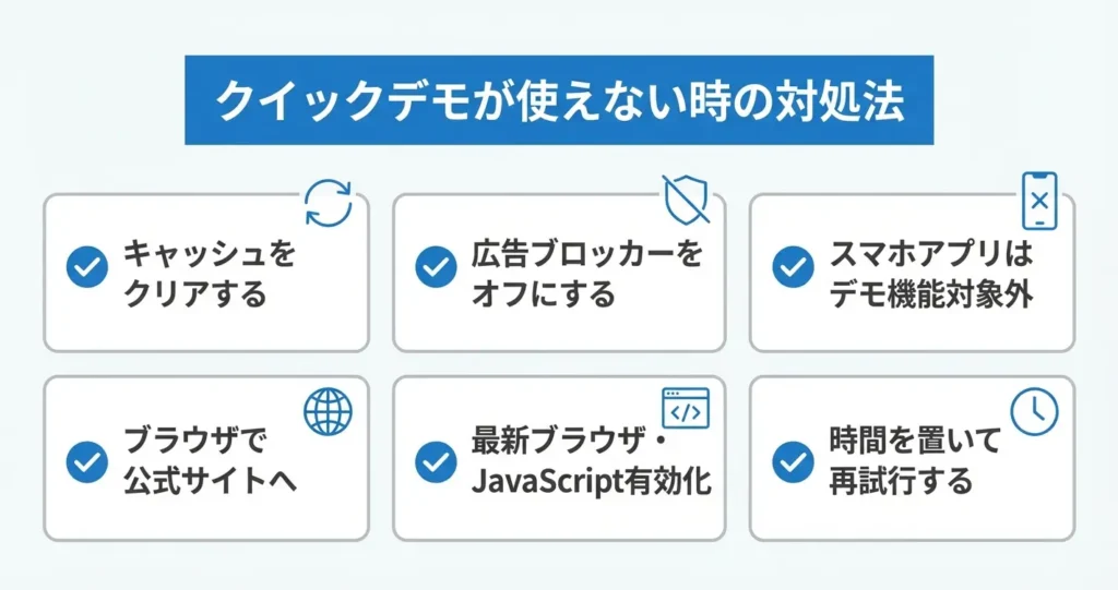 上記の対処法を試してもクイックデモが利用できない場合は、通信環境の問題や一時的なサーバー側のメンテナンスが考えられます。