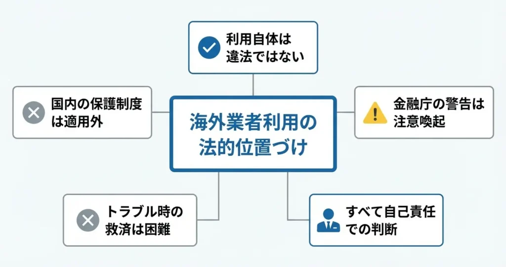 日本居住者が海外業者を利用すること自体は違法ではありませんが、金融庁未登録業者であるため自己責任となります
