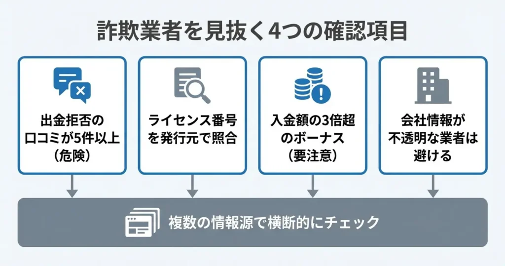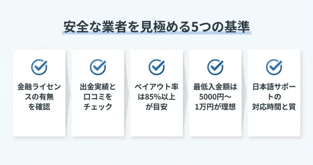 業者選定においては、出金実績の安定性、運営の透明性、サポート対応の質を重視することが重要です。