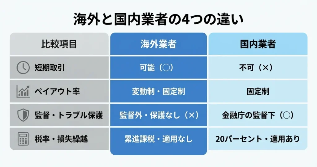 実際、海外業者は数多く存在し、運営実績・ライセンスの有無・出金トラブルの報告など、比較すべきポイントが複雑に絡み合っています。税金や最低購入額、勝率を左右する取引条件についても正しく理解しておく必要があります。