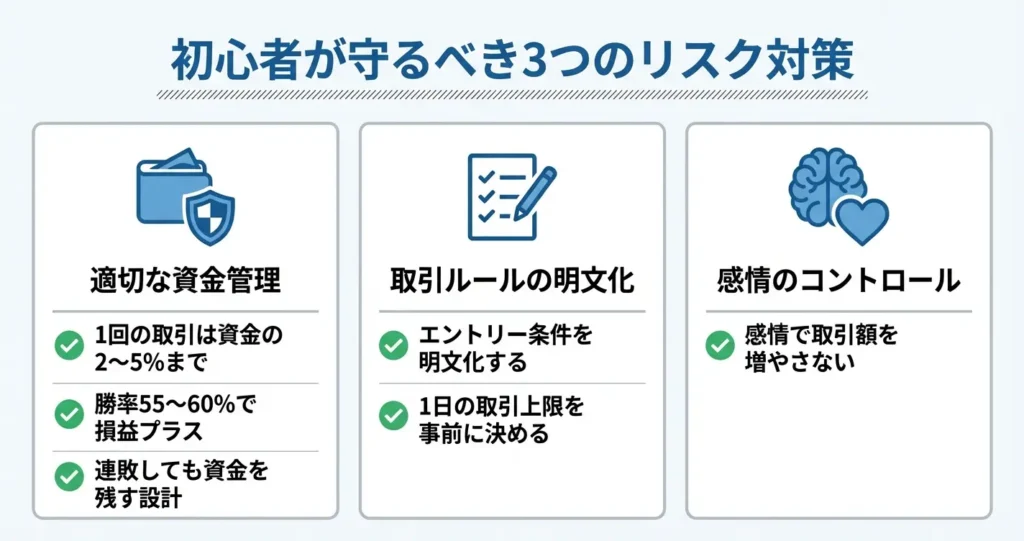 ルールがない状態では、負けを取り返そうとして取引額を増やす行動や、根拠のないエントリーが増え、結果として損失が拡大しやすくなります。