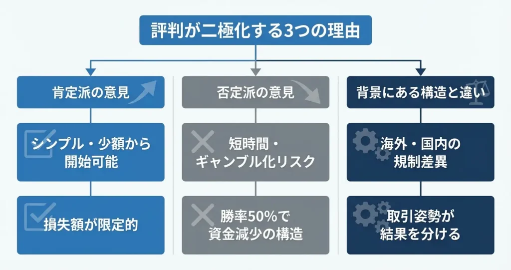 この極端な評価の分かれ方には、バイナリーオプションの仕組み自体が持つ特性と、利用者の取引姿勢の違いが影響しています。