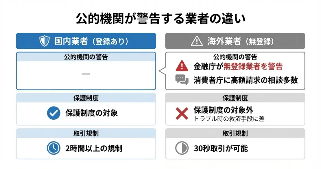 ここでは両機関が公表している警告内容と、国内外の業者に対する規制の違いを整理します。