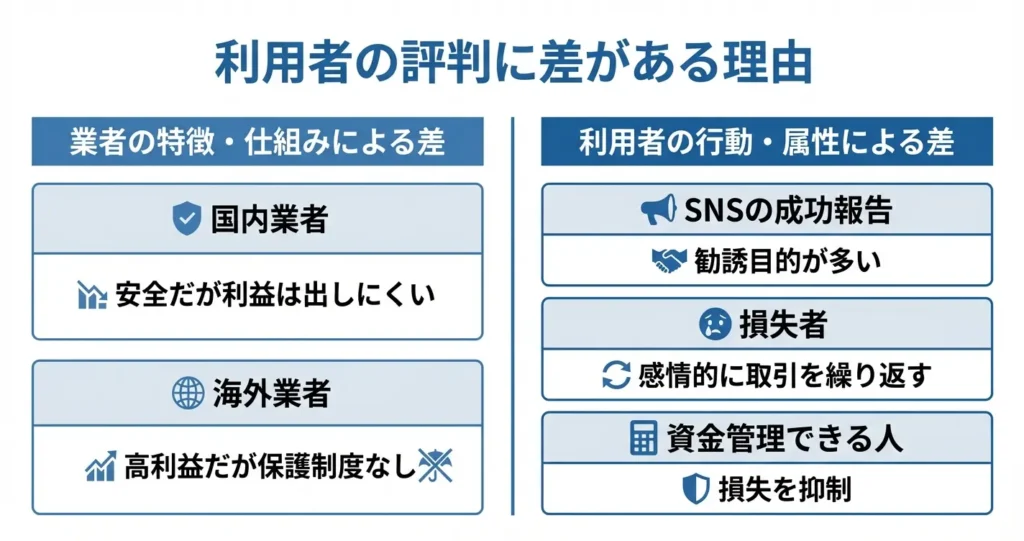 判断基準としては、金融庁の登録業者であるかどうかを必ず確認し、登録がない業者は原則として避けるべきとされています。どちらの業者を前提に語っているかによって、評価が正反対になることがあります。