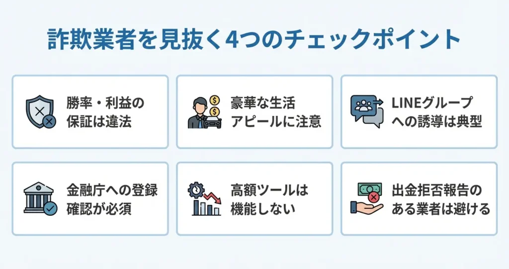 「必ず儲かる」「勝率90%以上」など断定的な表現を使っていないか注意が必要です。