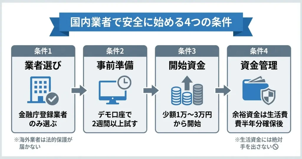 国内登録業者を選び、少額から慎重に始めることでリスクは相当程度抑えられますが、それでも投資である以上は損失の可能性があります。