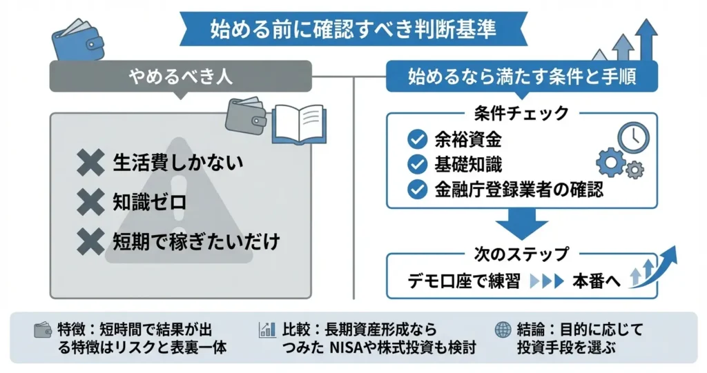 逆に、十分な余裕資金があり、損失が出ても冷静に受け入れられる心理状態にあり、デモ取引で仕組みを理解した上で少額から試す意思がある場合に限り、自己責任での検討が可能になります。
