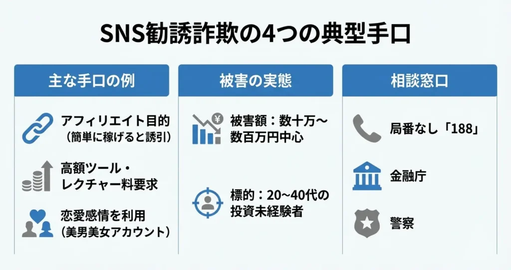 SNSやマッチングアプリを通じた個人からの勧誘、高額な情報商材やツールの購入を前提とした案内は、詐欺的な手法として金融庁や消費者庁が注意喚起している典型例です。