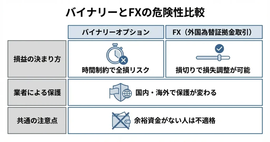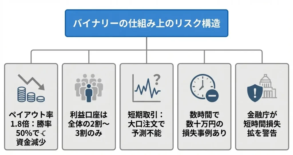 この仕組み自体はシンプルですが、短時間で損益が確定する構造が、損失の繰り返しや感情的な取引判断を誘発しやすく、後述する複数のリスク要因と結びついています。