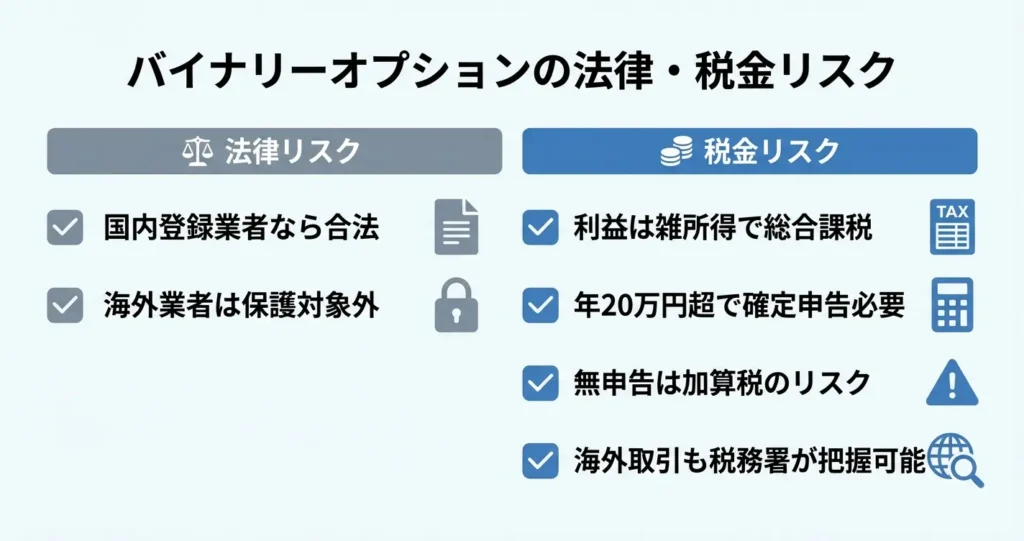 利用すること自体が違法になるわけではありませんが、日本の金融商品取引法に基づく審査や登録を受けていないため、トラブル時に法的保護を受けることはできません。
