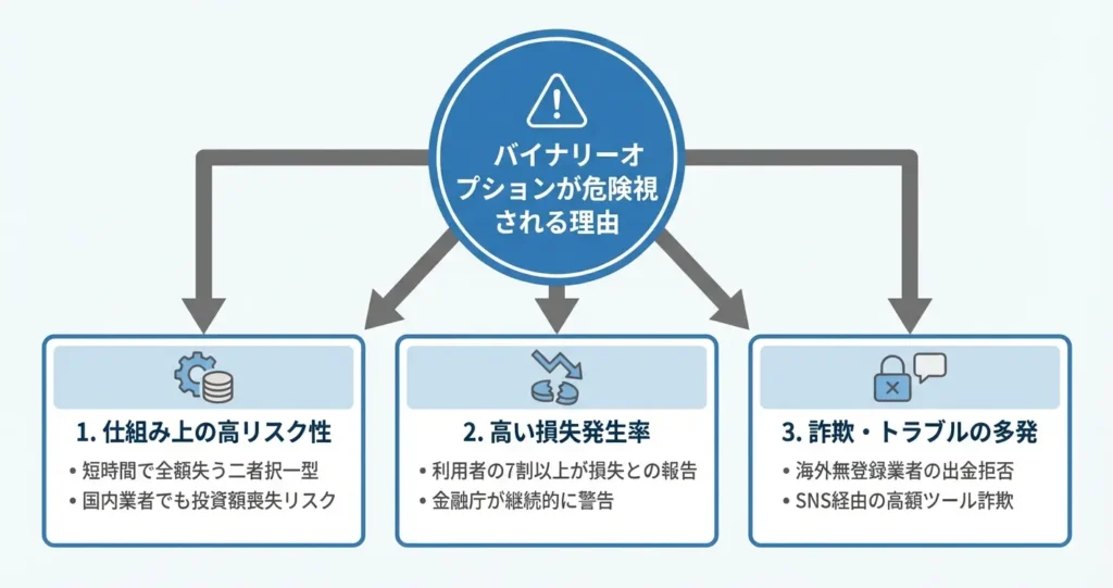バイナリーオプションには、金融庁が繰り返し警告を発している無登録業者の存在、顧客の約7割から8割が損失を出すとされる構造的な不利性、そして出金拒否や勧誘詐欺といった被害事例が多数報告されているという実態があります。