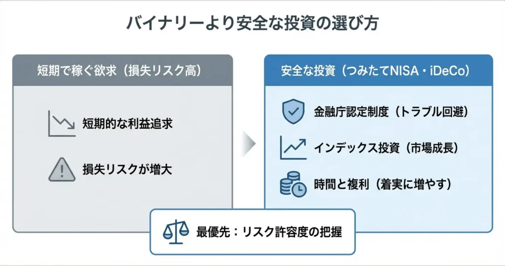 バイナリーオプションの危険性を理解し、より安全な選択肢の存在を知ることで、焦らず着実に資産を形成する道筋が見えてきます。