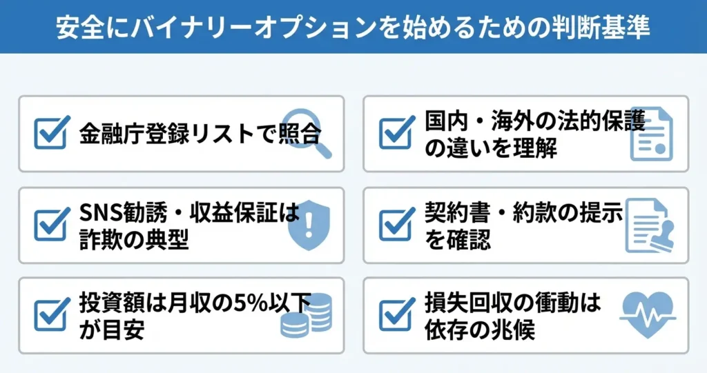 ここまでで、バイナリーオプションが「やばい」と言われる理由が、取引の仕組み・業者の信頼性・勧誘の手口という3つの軸で構成されていることが分かりました。