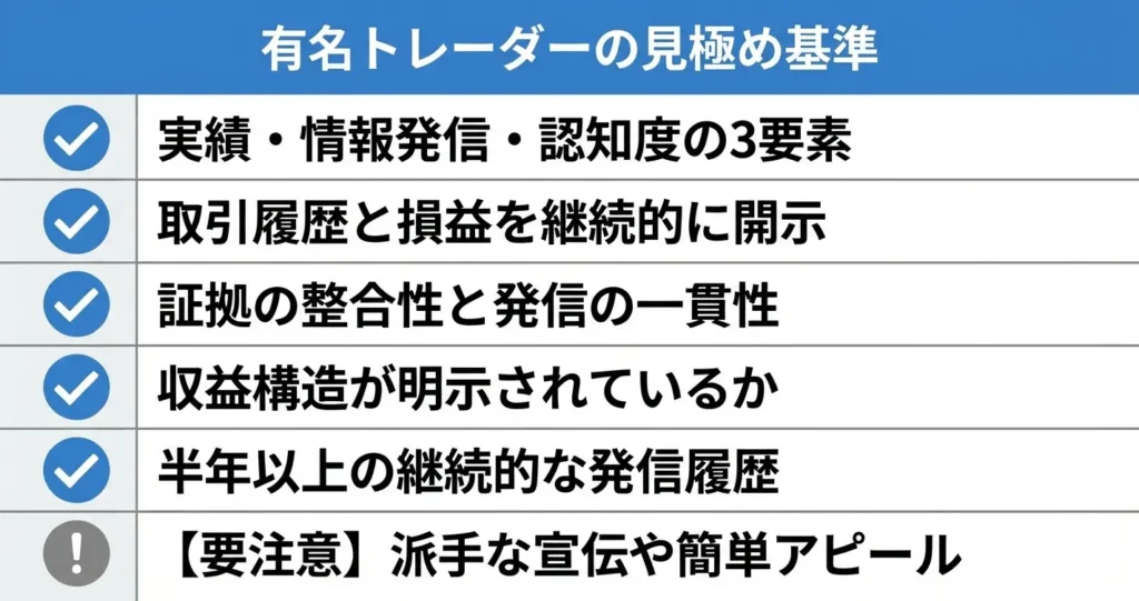 このセクションでは、有名トレーダーの定義を明確化し、本物と偽物を見分けるための具体的な判断基準を整理します。これらの基準を理解することで、以降のトレーダー比較情報を正しく評価できるようになります。