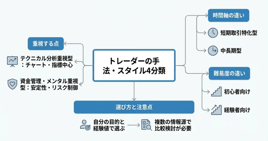 ここでは主要な分類軸を示し、それぞれの特徴と適性を整理することで、あなたが参考にすべきトレーダーを判断する基準を提供します。