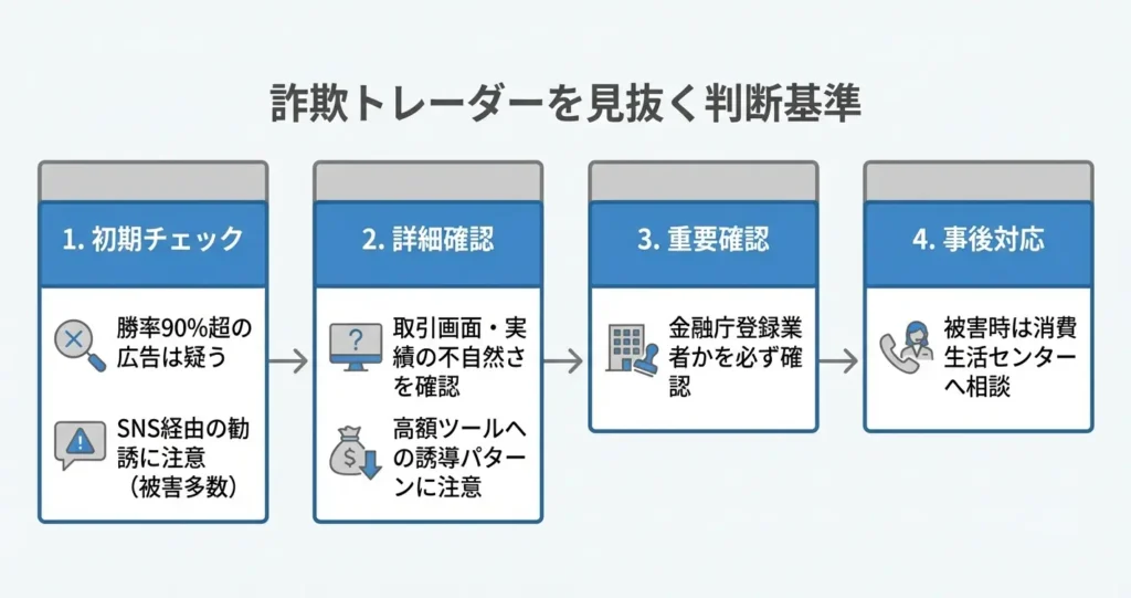 ここまでで、有名トレーダーの情報をどう学習に活かすかの枠組みが整いました。次は、実際に詐欺や悪質な情報発信者を見抜くための具体的な判断基準を確認していきます。
