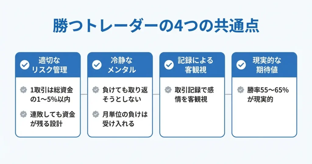 ここでは再現性のある成功パターンとして、資金管理・メンタル・学習習慣・現実的な数値目標の4つの観点から整理します。