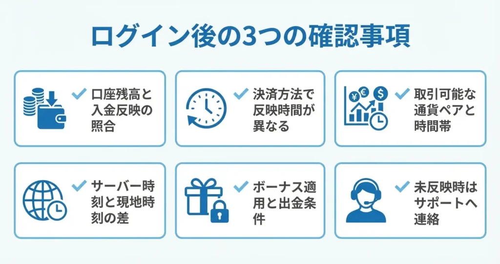 ログイン直後は「残高・取引環境・キャンペーン適用状況」の3点を優先的に確認しましょう