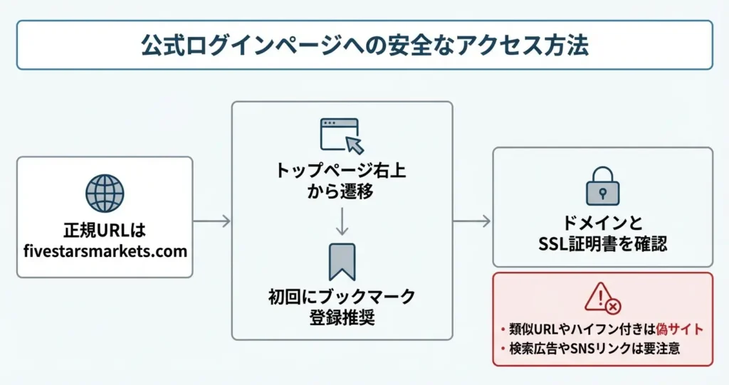 ログインページへアクセスする際は、ブラウザのアドレスバーに表示されるURLが「https://fivestarsmarkets.com/」で始まっていること、そしてアドレスバーの左側に鍵マークが表示されていることを必ず確認してください