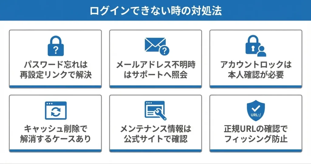 本セクションでは、代表的なログインエラーの原因を特定し、それぞれに対応した解決手順を示します。多くのケースは利用者側で解決可能であり、適切な手順を踏むことでアカウントへのアクセスを回復できます