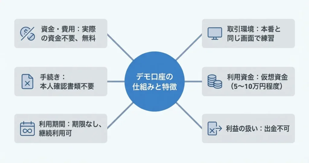 ここではデモ口座の基本的な仕組みと、本番口座との違いを確認していきます。