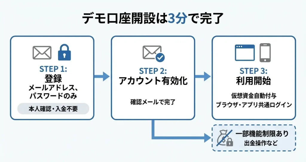 また、デモ口座では本人確認書類の提出が不要で、メールアドレスなど最小限の情報のみで利用を開始できる点も特徴です。