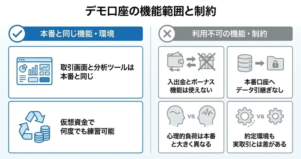 一方、デモ口座では出金操作や資金移動のテスト、リアルマネーでの入金処理、一部のキャンペーンや特典の利用はできません。