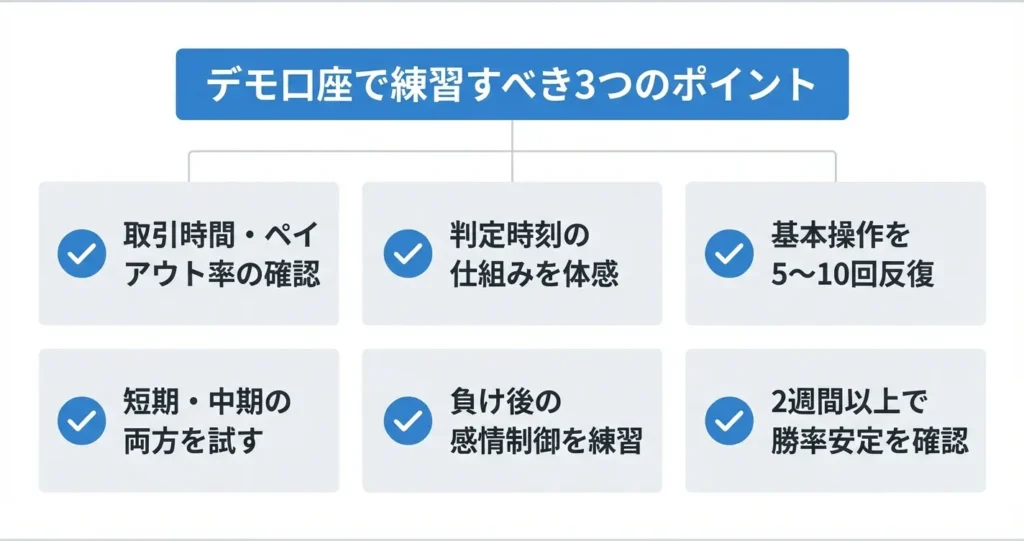 デモ口座を開設したら、まず取引可能な時間帯とペイアウト率の表示位置を確認し、注文から結果確定までの一連の流れを実際に操作してみることが推奨されます。