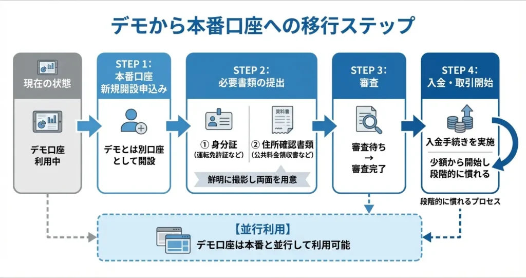 デモ口座で取引の感覚をつかんだ後は、本番口座を新たに開設して実際の取引を始める流れになります。移行といっても、デモ口座とは別に本番口座を開設する手続きです。