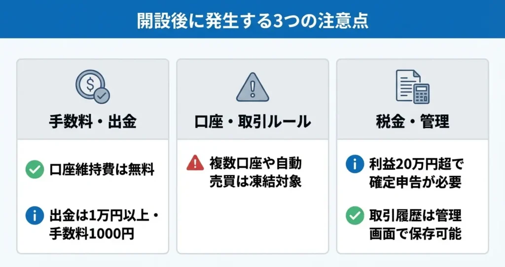 ここでは、口座維持に関わるコスト、凍結リスク、税務上の義務など、事前に把握しておくべき注意点を整理します。これらを理解した上で手続きを進めることで、安心して取引を開始できます。