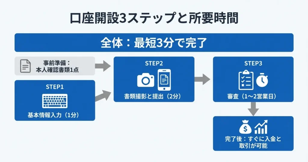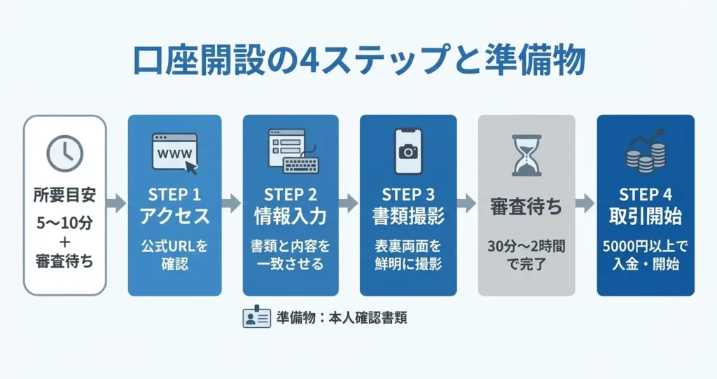 手続きそのものは5分から10分程度で終わり、書類の承認は通常1営業日以内に完了するため、最短で申し込み当日中に取引を開始できる状態になります。