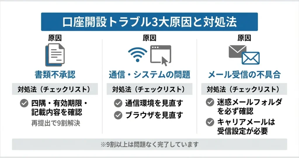 なお、ここで紹介したトラブルは発生する可能性があるものの、実際には9割以上の方が特に問題なく口座開設を完了しています。