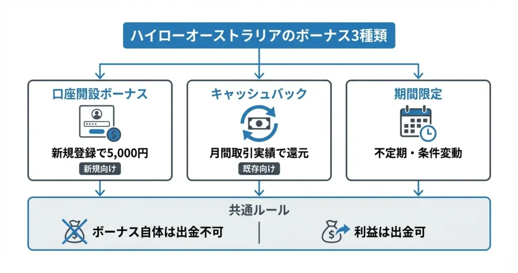 ハイローオーストラリアでは、新規ユーザー向けと既存ユーザー向けの複数のボーナスが提供されています。