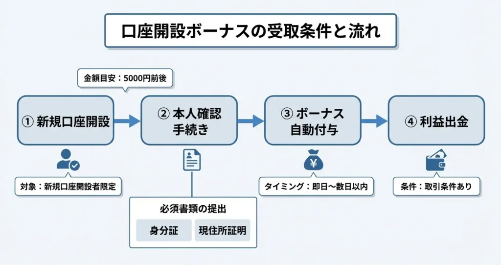このセクションでは、ボーナスの具体的な金額、適用されるための条件、付与されるタイミング、そして受け取りに必要な手続きの有無を順に整理します。口座開設を検討している方が、事前に準備すべき内容を把握できる構成としています。
