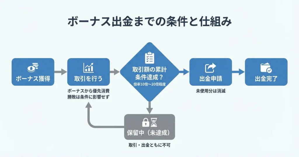 出金するには一定の取引条件をクリアする必要があり、ボーナスと現金では使用される順序も異なります。このセクションでは、ボーナスを実際に出金可能な状態にするための条件と、取引における使い方のルールを整理します。