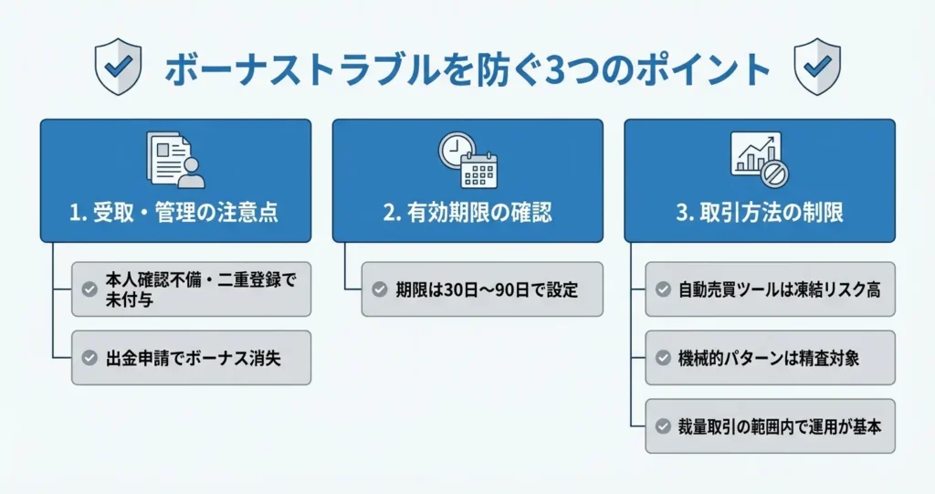 ボーナス失効の条件としては、一定期間取引が行われない場合や、規約違反と判断される取引パターンが検出された場合などが該当します。通常の取引を継続している限り失効リスクは低いものの、長期間放置せず計画的に取引を進めることが安全です。