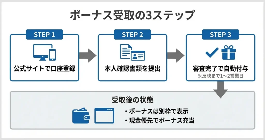 ボーナスは、口座開設手続きが完了した後、一定の条件を満たした段階で自動的に付与される仕組みです。