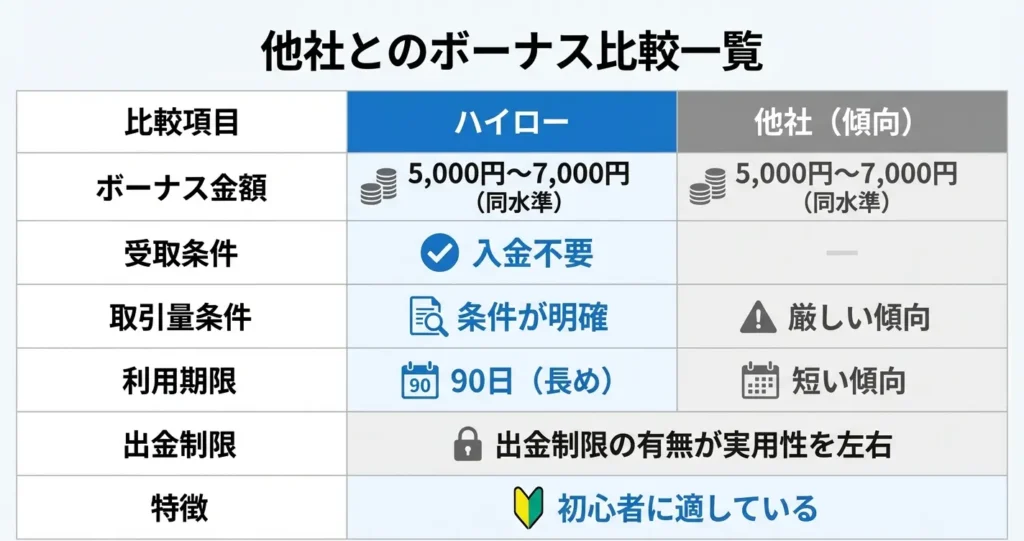 ハイローオーストラリアのボーナスが他社と比べてどの程度有利なのかを判断するには、金額だけでなく出金条件や利用制限を含めた総合的な比較が必要です。