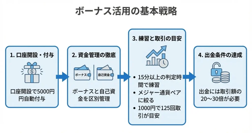 ボーナスは取引の感覚をつかむための練習機会として位置づけ、勝率と判断パターンを記録することに重点を置くべきです。