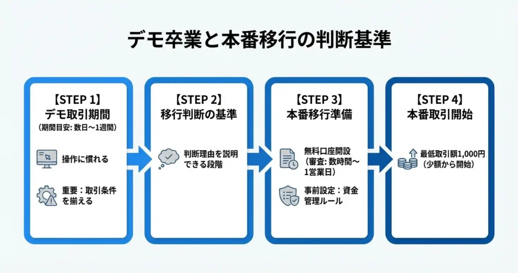 デモ取引は練習に有効ですが、いつまでも続けるべきではありません。このセクションでは、本番口座に移行する判断基準と、スムーズに実取引を始めるための準備について解説します。