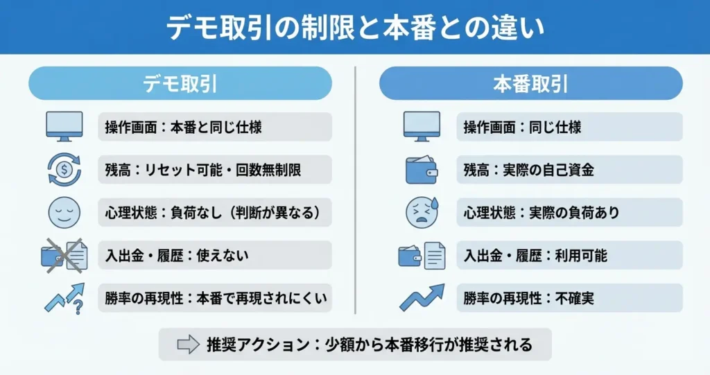 また、デモでは資金管理の意識が希薄になりやすく、本番では避けるような高額取引や連続エントリーを試してしまうケースも少なくありません。