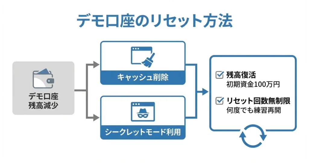 デモ取引の基本操作を理解したら、次に知っておくべきは仮想資金の仕組みとリセット方法です。次のセクションでは、デモ口座の仮想資金がどのように管理されているかを解説します。