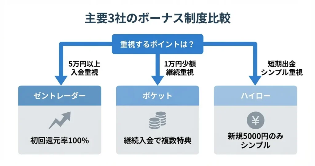 自身の取引スタイルや出金頻度に応じて、ボーナスの利用可否を選ぶとよいでしょう。
