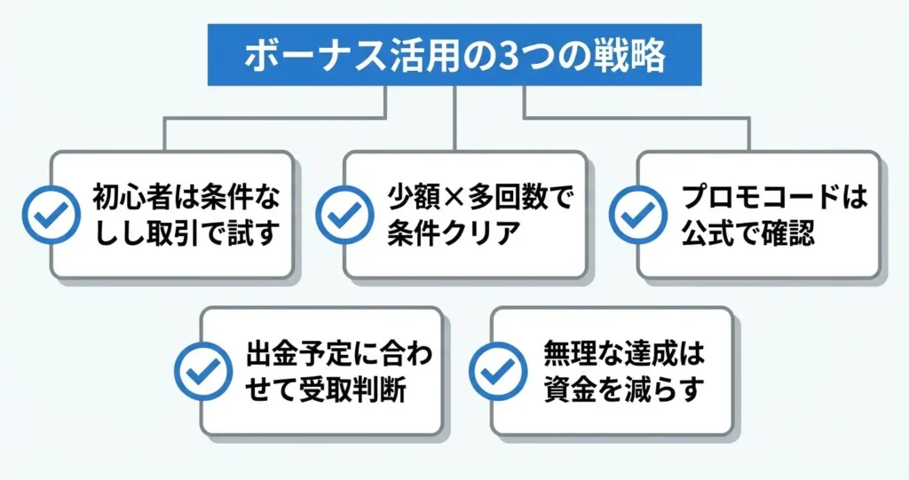 このセクションでは、リスクを抑えた使い方から条件クリアのコツ、最新情報の入手方法まで、実務的な視点で活用戦略を整理します。初心者から経験者まで、自分の取引方針に合った使い方を判断できる内容です。