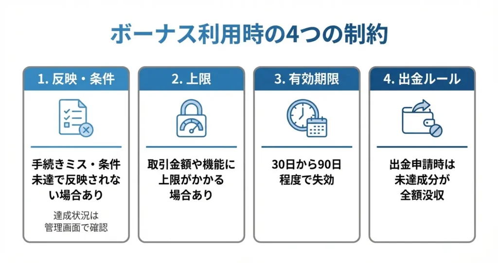 条件の詳細はボーナス付与時の規約で確認できるため、取引前に内容を把握しておくことが重要です。