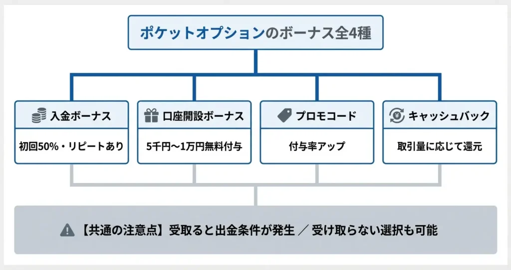 ポケットオプションで提供されているボーナスの種類一覧