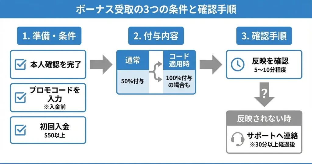 このセクションでは、初回入金ボーナスの具体的な内容、プロモコードを使った特典の活用方法、そしてボーナスがいつ反映されるかの確認手順を説明します。