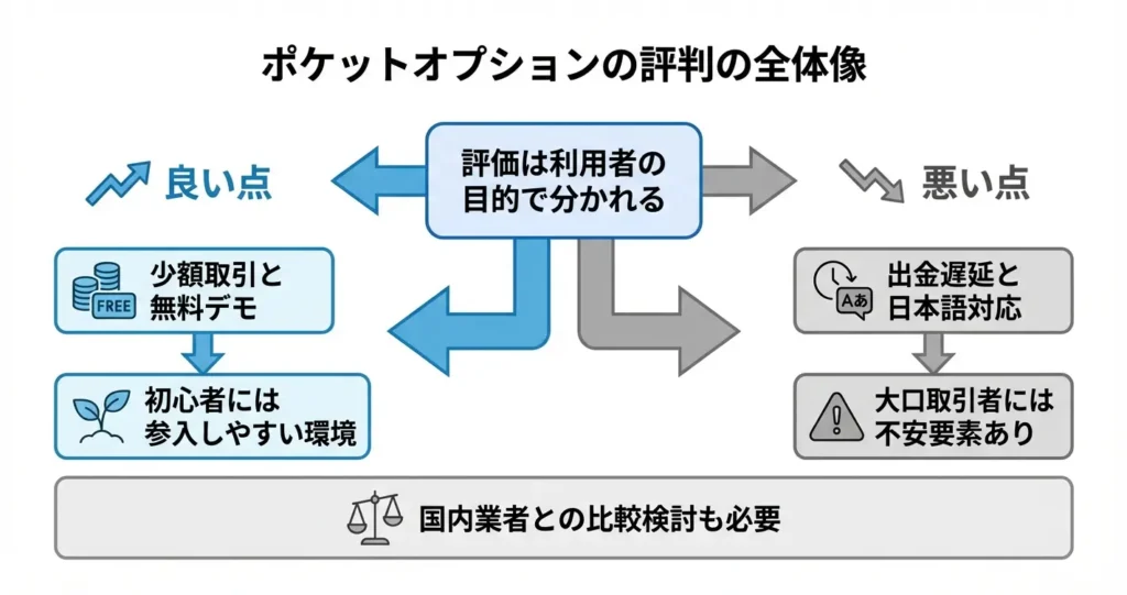 このセクションでは、良い評判と悪い評判の両面から、ポケットオプションの実態を整理して提示します。